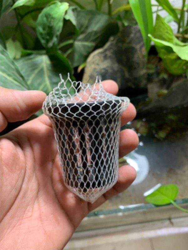 Esta maceta pequeña con red es un accesorio práctico para acuarios plantados, proporcionando un entorno para el crecimiento de plantas acuáticas.