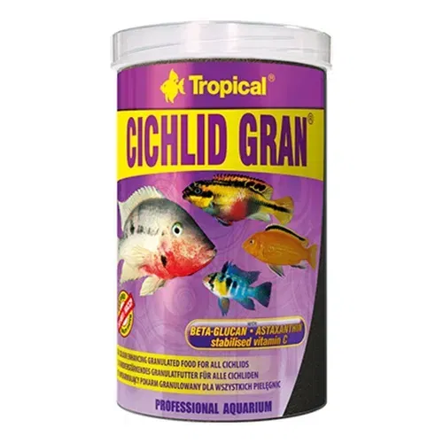 Tropical Cichlid Gran es un alimento granulado completo diseñado para cíclidos de agua dulce. Su fórmula equilibrada aporta proteínas, vitaminas y minerales que favorecen el crecimiento, la vitalidad y la coloración natural de los peces.