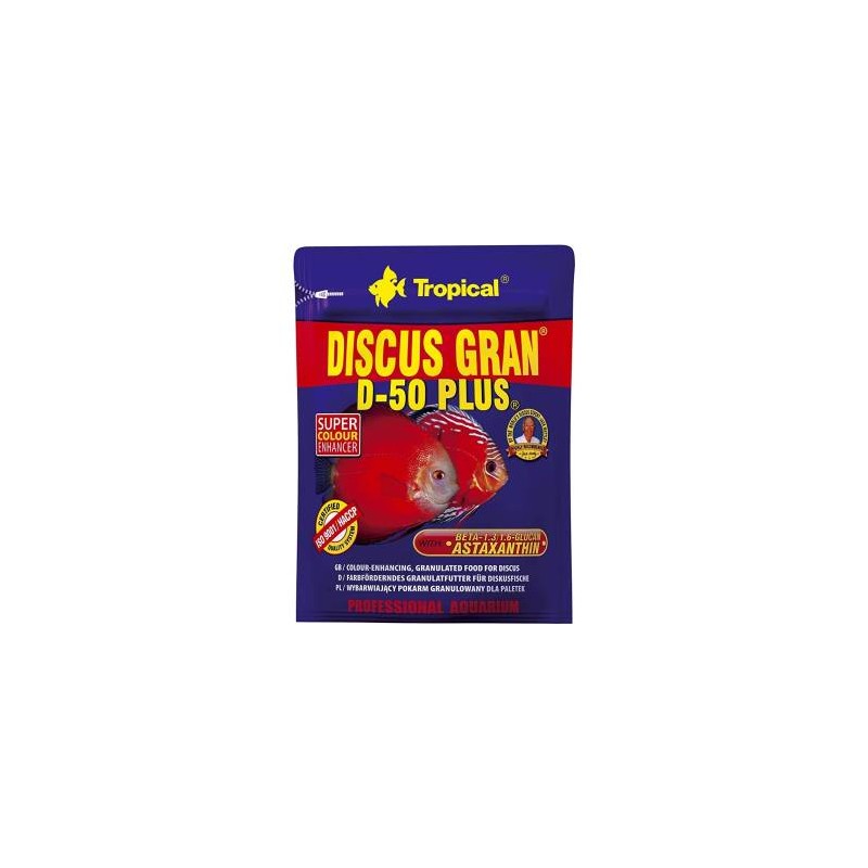 Tropical Discus Gran D-50 Plus es un alimento granulado premium especialmente formulado para peces disco. Su fórmula rica en proteínas y nutrientes esenciales favorece el crecimiento, la vitalidad y ayuda a mantener la coloración intensa de estos peces exigentes.