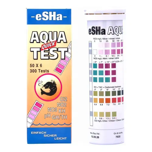 ESHA Aqua Quick Test 6 en 1 es un kit de análisis rápido diseñado para monitorear los parámetros esenciales del agua en acuarios de agua dulce y salada. Permite medir de manera sencilla y precisa seis indicadores clave para mantener un ambiente saludable para peces y plantas.