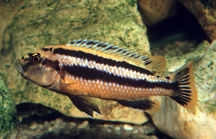 Melanochromis auratus es una especie vibrante y llamativa originaria del Lago Malawi, conocida por su intenso colorido y su comportamiento activo. Este pez es fácil de identificar por su brillante color amarillo dorado en los machos, con algunas tonalidades azules, mientras que las hembras suelen ser de un color más apagado, generalmente gris o marrón. Alcanza un tamaño de alrededor de 10 cm de longitud, lo que lo hace adecuado para acuarios de tamaño medio.