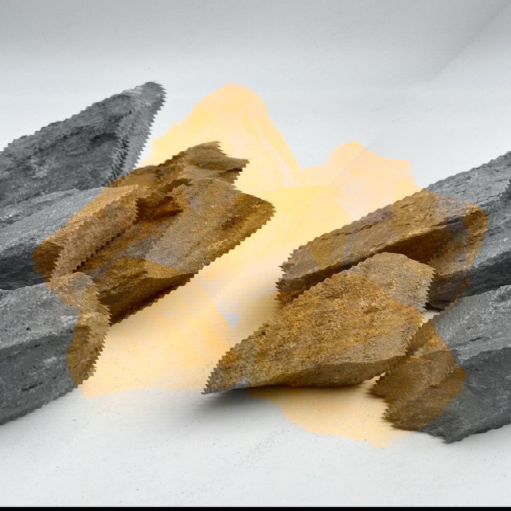 La roca jaspe mostaza se caracteriza por sus llamativos tonos amarillos y marrones que aportan un efecto cálido y vibrante dentro del acuario. Con su textura irregular y aspecto rocoso, es ideal para crear paisajes naturales que resalten entre plantas y peces de colores vivos.