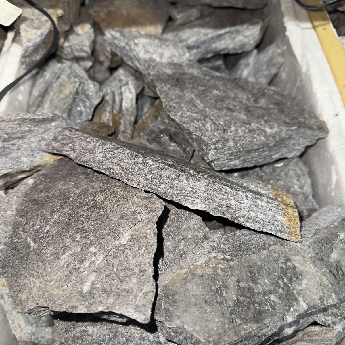 Es una piedra metamórfica compuesta por mica, cuarzo y feldespato, con un tono gris oscuro y sutiles brillos plateados. Su textura y color neutro la hacen perfecta para crear paisajes acuáticos sobrios, naturales y de alto contraste.