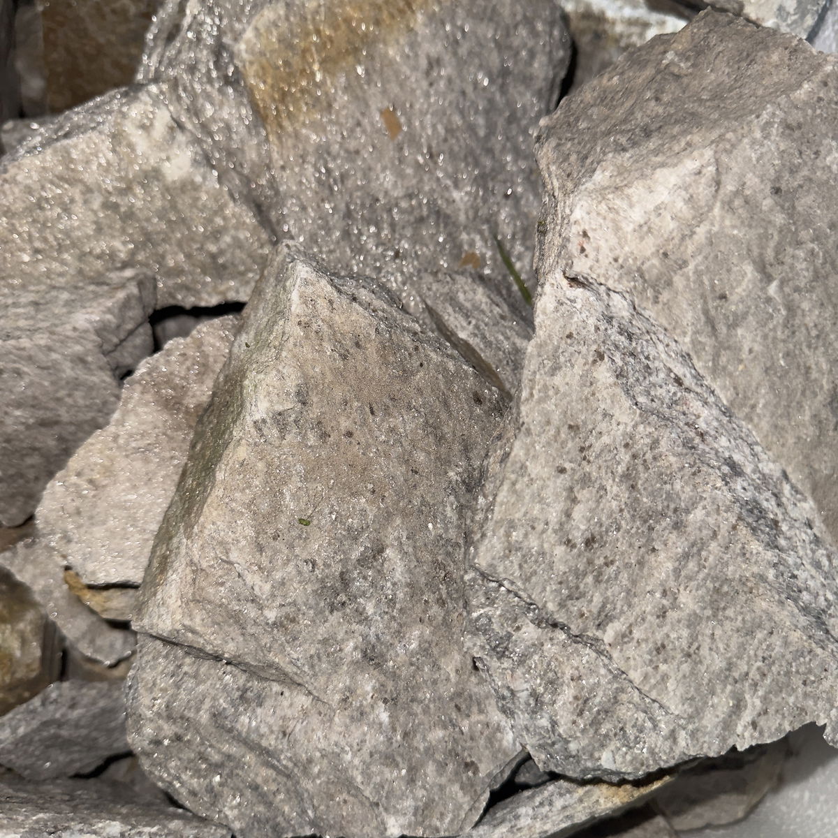 Es una piedra metamórfica con vetas grises claras y brillos naturales producidos por su alto contenido de mica. Su textura irregular y su tono claro aportan luminosidad y contraste dentro del acuario, generando un paisaje natural, limpio y equilibrado.