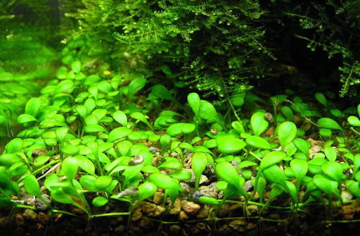 El Glossostigma elatinoides es una de las plantas tapizantes más populares y apreciadas en el acuarismo. Ideal para la zona delantera, forma un césped denso de pequeñas hojas ovaladas de color verde brillante que crean un efecto de alfombra natural en el paisaje acuático.