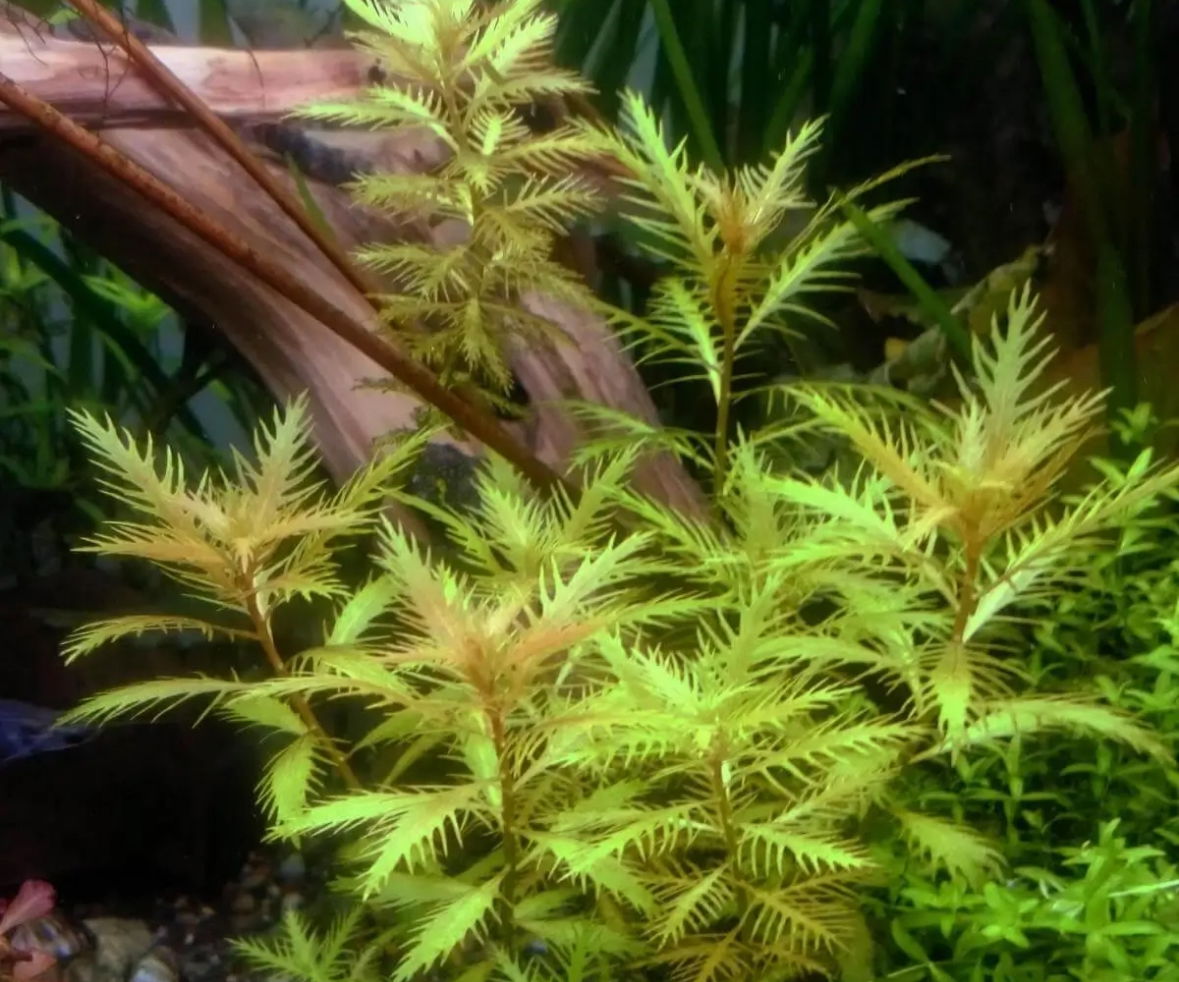 La Proserpinaca palustris, conocida como “mermaid weed”, es una planta de tallo muy decorativa, ideal para la zona media o trasera del acuario. Sus hojas tienen un aspecto único: en su forma sumergida se vuelven finamente dentadas, creando un efecto plumoso y exótico. Bajo buena iluminación, adquiere tonos cobrizos, anaranjados o rojizos, convirtiéndose en un punto focal llamativo.