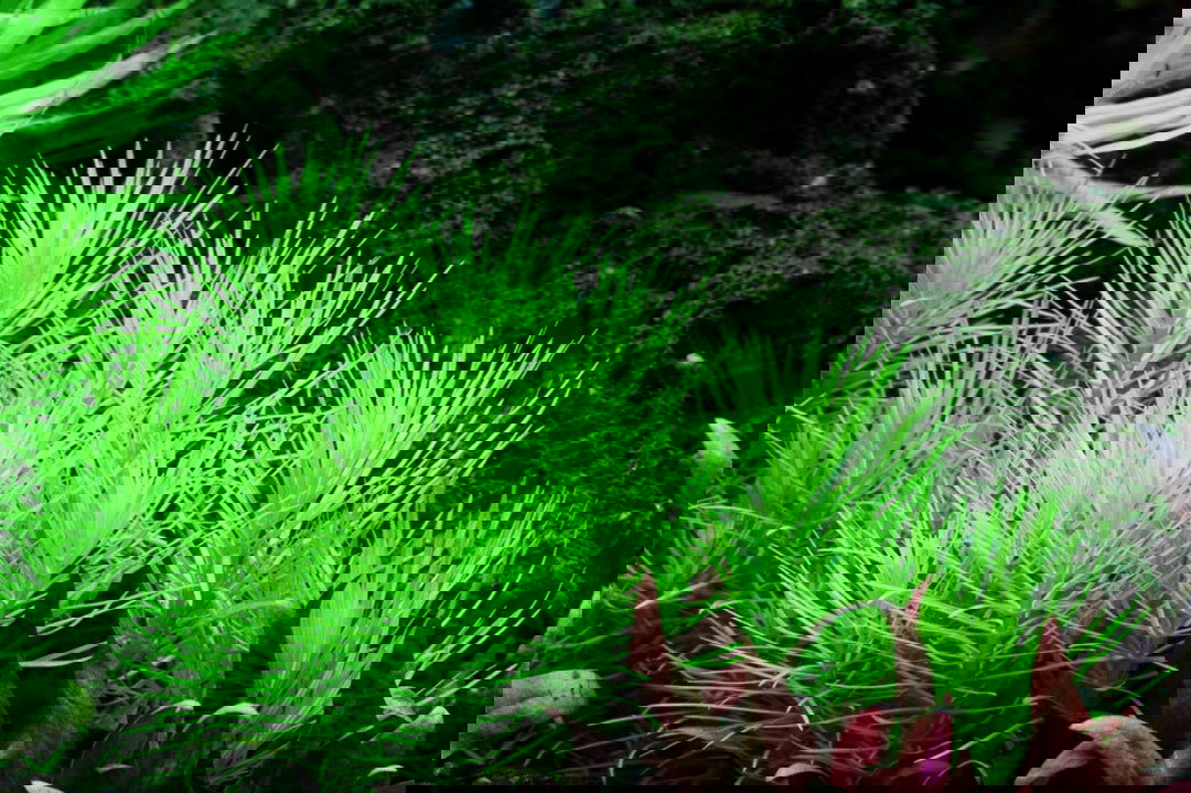 El Pogostemon erectus es una planta de tallo muy apreciada por su porte vertical y su forma de “pino acuático”. Sus hojas finas y alargadas de color verde intenso crean un efecto plumoso y elegante, ideal para la zona trasera del acuario, donde aporta altura y textura al paisaje.