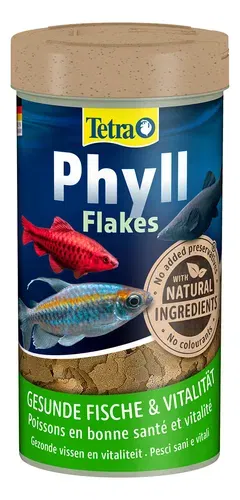 Tetra Phyll es un alimento en escamas con alto contenido vegetal, formulado para peces herbívoros y omnívoros. Aporta fibra y nutrientes esenciales que favorecen una digestión saludable, mejoran la vitalidad y ayudan a mantener el equilibrio del acuario.