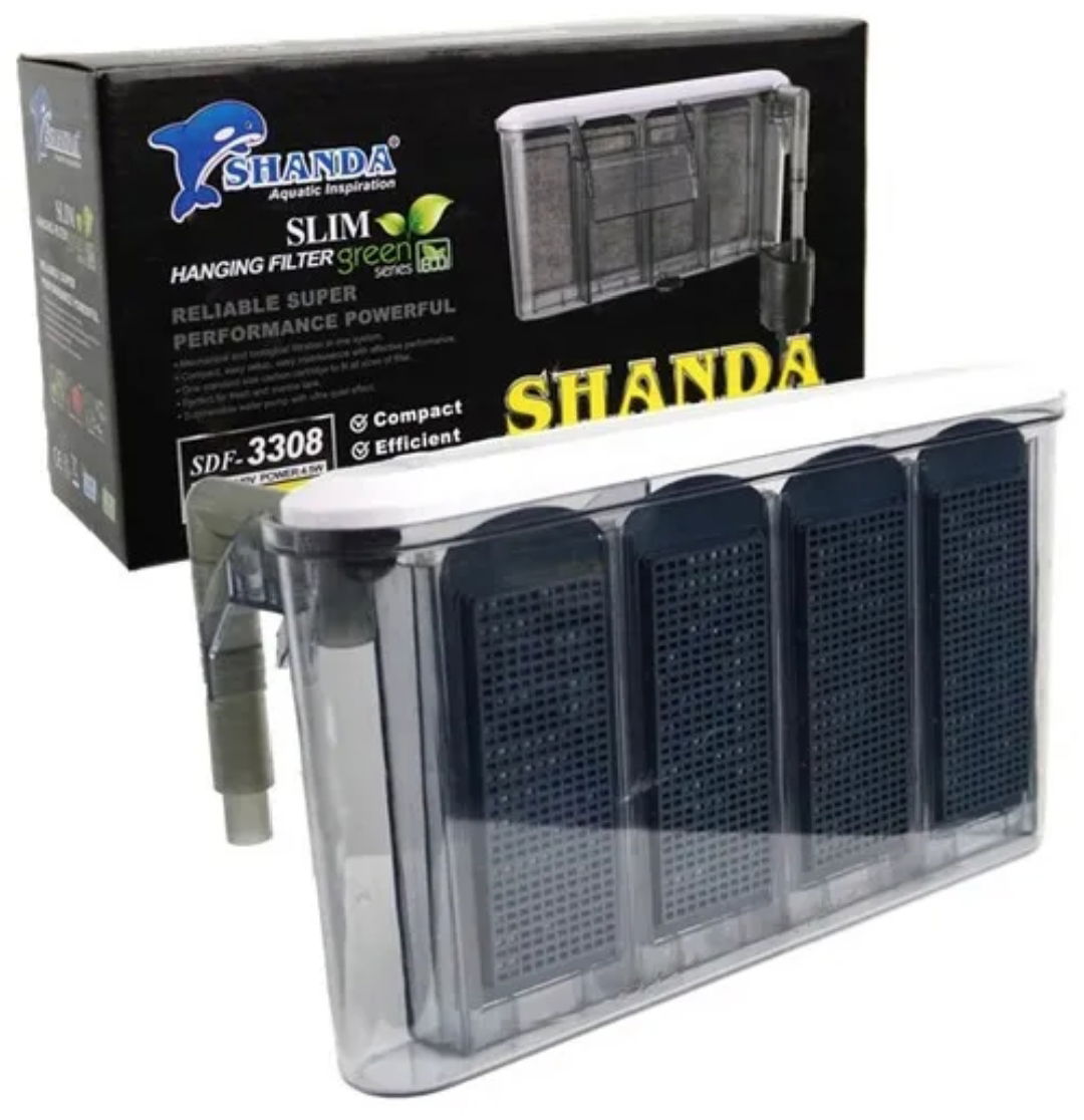 El filtro cascada Slim SDF3308 de Shanda es un hang-on delgado y silencioso para acuarios pequeños y medianos. Con 500 L/h y 4,5 W, ofrece filtración mecánica y biológica eficiente y mejora la oxigenación por efecto cascada, ocupando mínimo espacio.