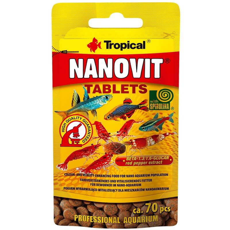 Tropical Nanovit Tablets es un alimento en tabletas especialmente diseñado para peces ornamentales pequeños. Su fórmula completa aporta vitaminas, proteínas y nutrientes esenciales que favorecen el crecimiento, la vitalidad y una buena coloración.